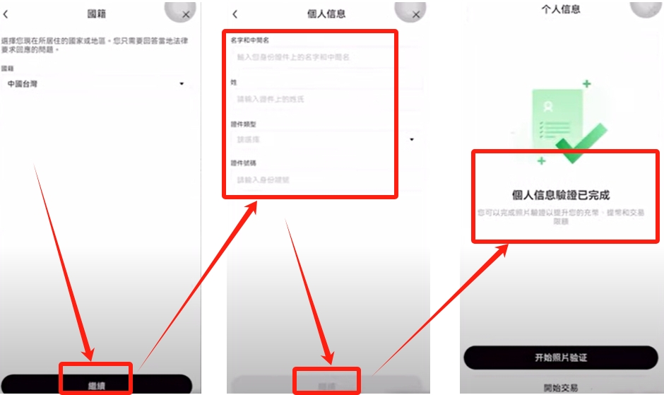 进入账户首页点击个人图标,完成基础认证(LV0→LV1)。KYC1仅需提交身份 件信息,15分钟内可提升至5BTC单日退先额度。