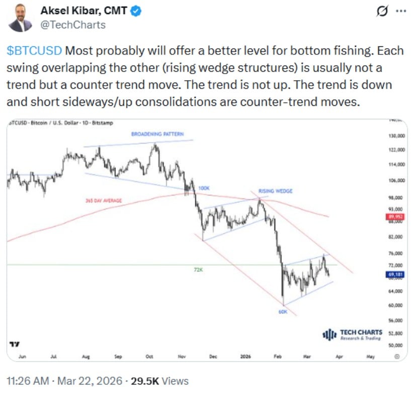 Aksel Kibar将比特币上升楔形解读为警示信号,建议在持续波动中耐心等待6万美元附近的入场机会。来源:Aksel Kibar(CMT认证) via X