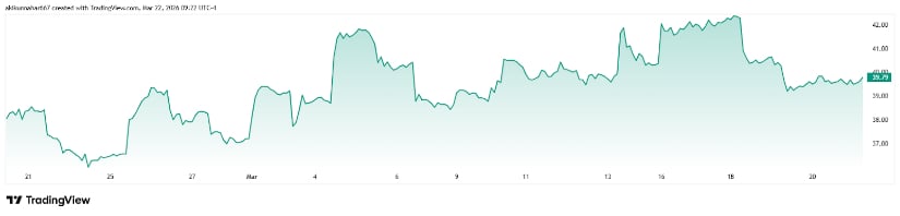 截至发稿,IBIT交易价格约39.77美元,24小时跌幅0.13%。来源:TradingView