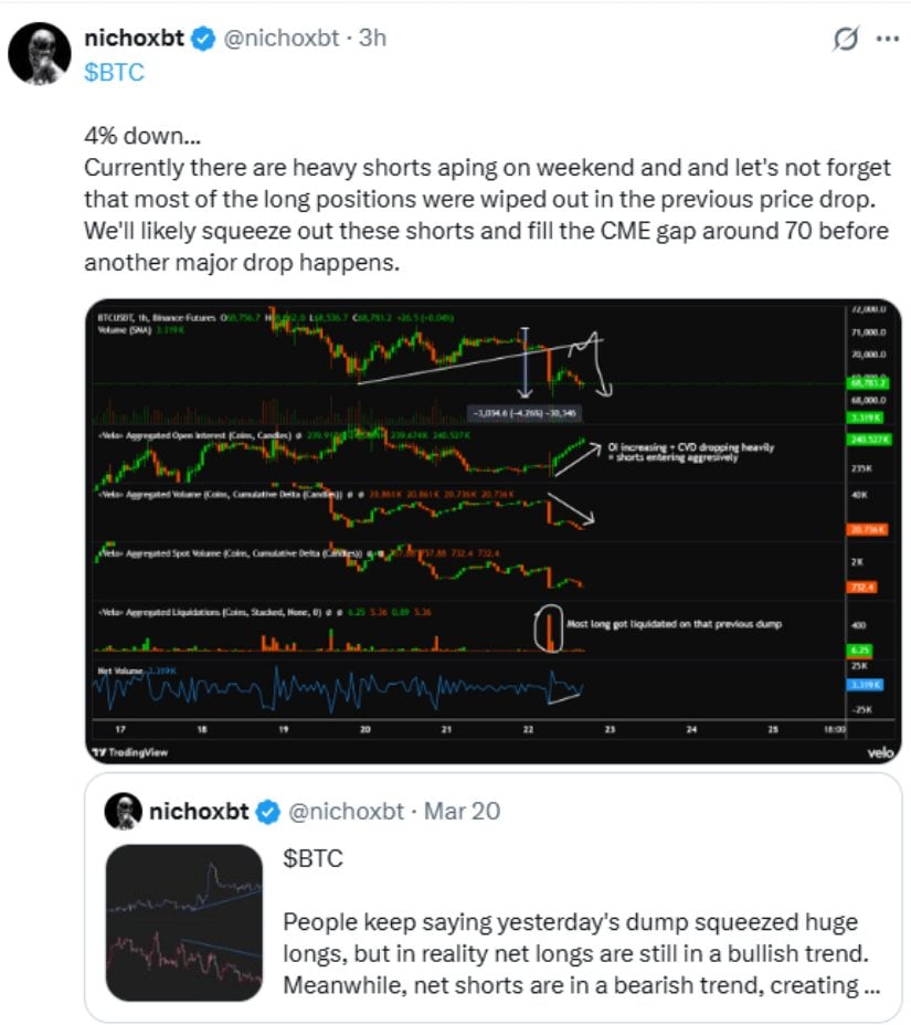 尽管此前遭遇多头清算,比特币近期下跌或触发向7万美元CME缺口的空头挤压,随后可能迎来更大跌幅。来源:nichoxbt via X