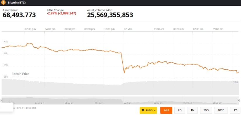 截至发稿,比特币交易价格约68,493.77美元,24小时跌幅2.97%。来源:Brave New Coin比特币价格指数