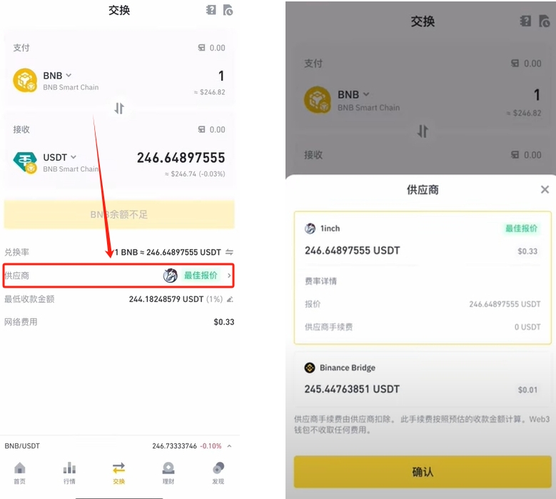 兑换功能采用one inch作为流动性聚合器,智能选择最优交易路径。理财板块推荐使用USDC等稳定币,通过Venus协议获得稳定收益。