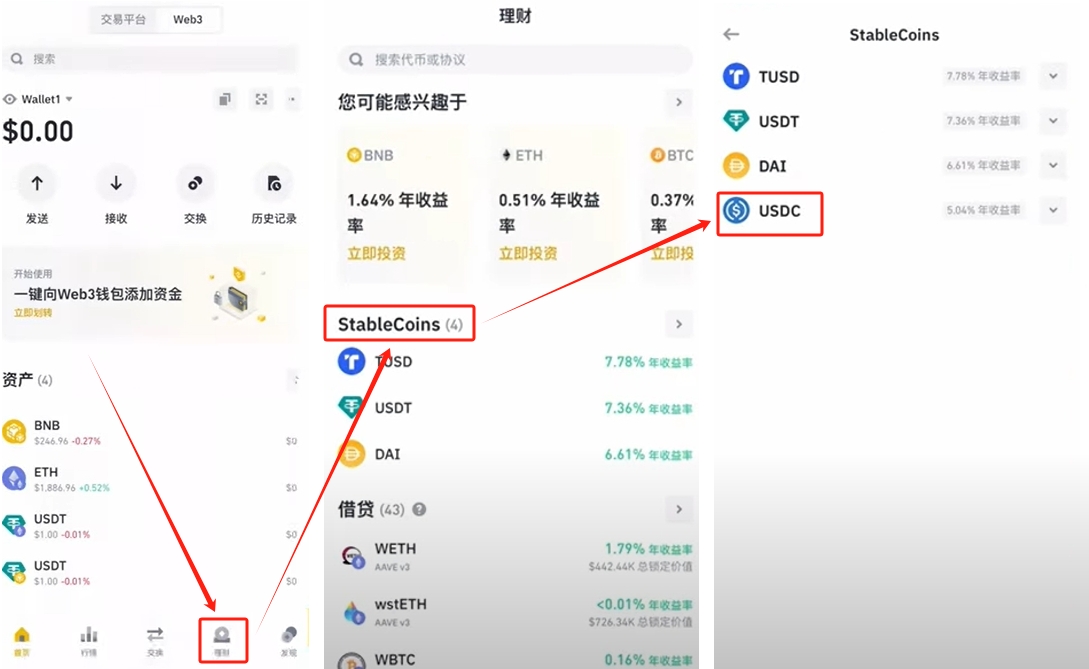 完成资金划转后,进入理财板块选择USDC进行质押操作。注意需预留足够ETH作为Gas费。