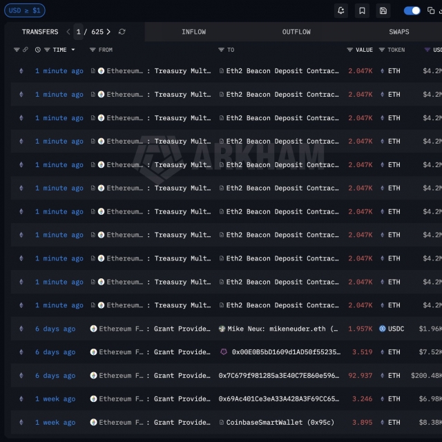 Bitmine并非唯一锁定ETH参与PoS合约的机构。据Arkham在X平台披露,致力于支持ETH区块链的非营利组织以太坊基金会,刚向质押存款合约转入价值4620万美元的ETH。"这是他们史上最大单笔质押,"Arkham解释道。