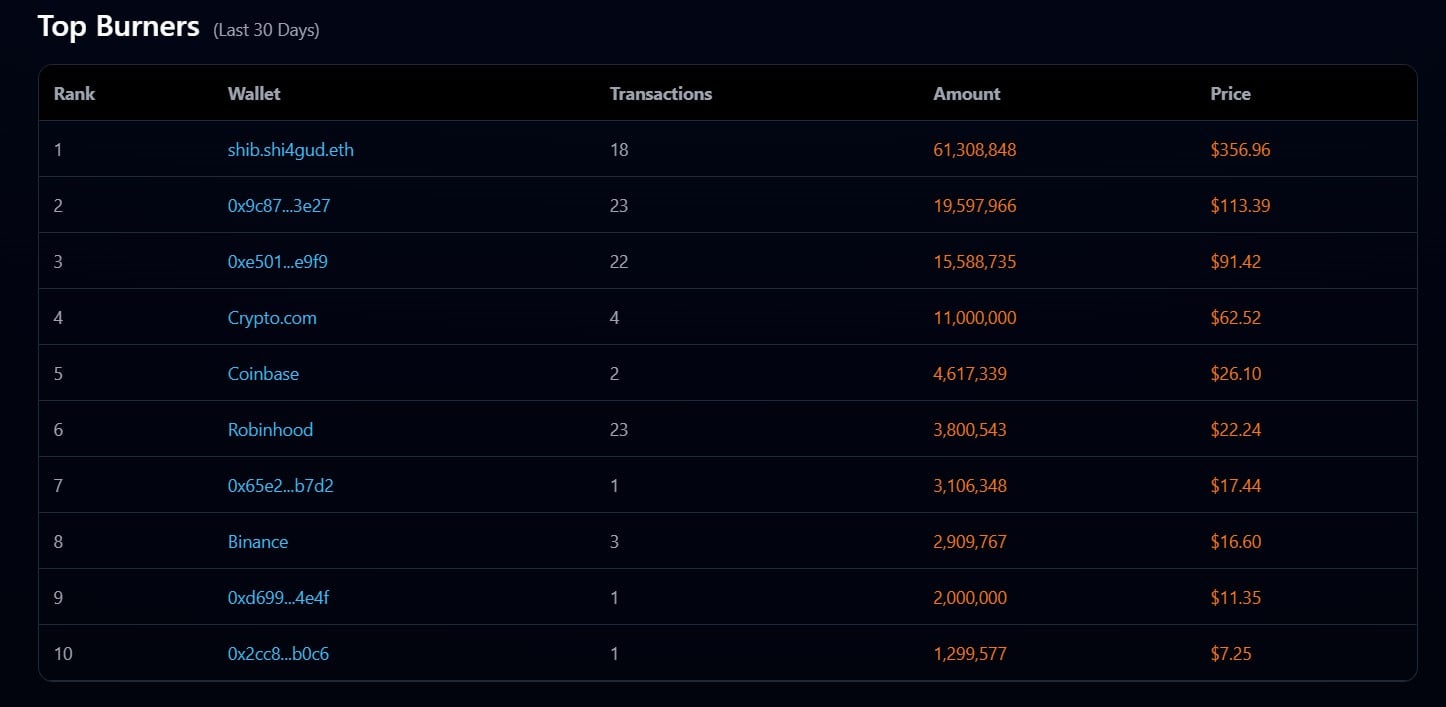 过去一个月数据显示:Crypto.com以销毁1100万SHIB居首,Coinbase(461万)、Robinhood(380万)和币安(290万)紧随其后。