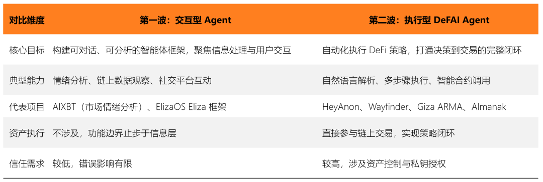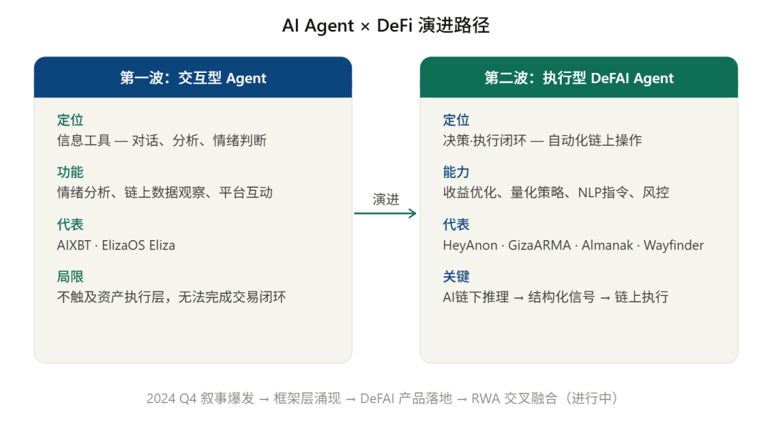 根据 The Block 的研究,DeFAI 的演进并非一蹴而就,而是经历了两个不同的阶段--从早期以信息处理为主的交互型 Agent,到如今能够真正介入链上操作的执行型系统。