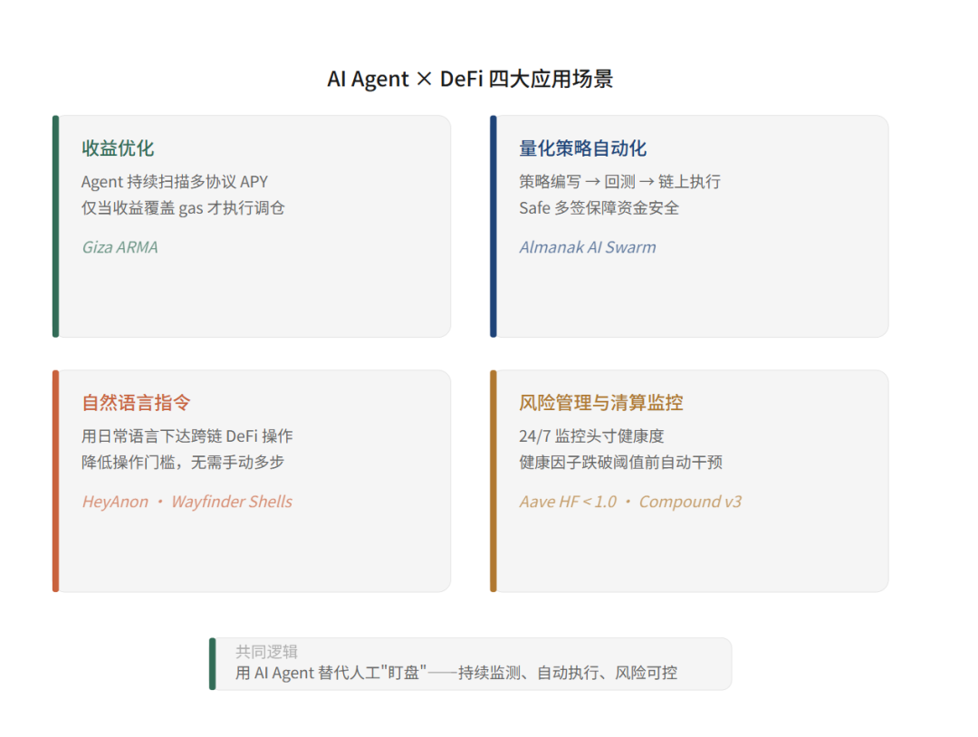 整体来看,当前 DeFAI 的应用探索已围绕四个核心方向形成相对成熟的落地格局,分别对应链上操作中"收益效率、策略执行、交互门槛与风险管控"四类核心痛点。