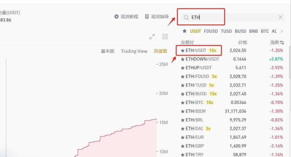 4. 进入现货交易界面搜索ETH/USDT交易对