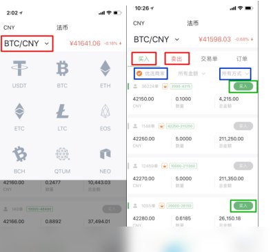 登录欧易OKX App或网页版,点击底部"买币",切换到顶部Tab的"C2C交易"页面(区别于"快捷买币")。在页面顶部选择"购买"方向,币种可选USDT、BTC、ETH或USDC,本地货币区选择chy,下方即列出全部挂单商家及其单价、可交易量、限额区间和支持的付款方式。