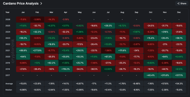 历史数据佐证了这种乐观预期:纵观历年四月,卡尔达诺价格收盘上涨天数显著多于下跌。CryptoRank统计显示,ADA四月平均回报率达14.1%,预示可能出现积极行情。