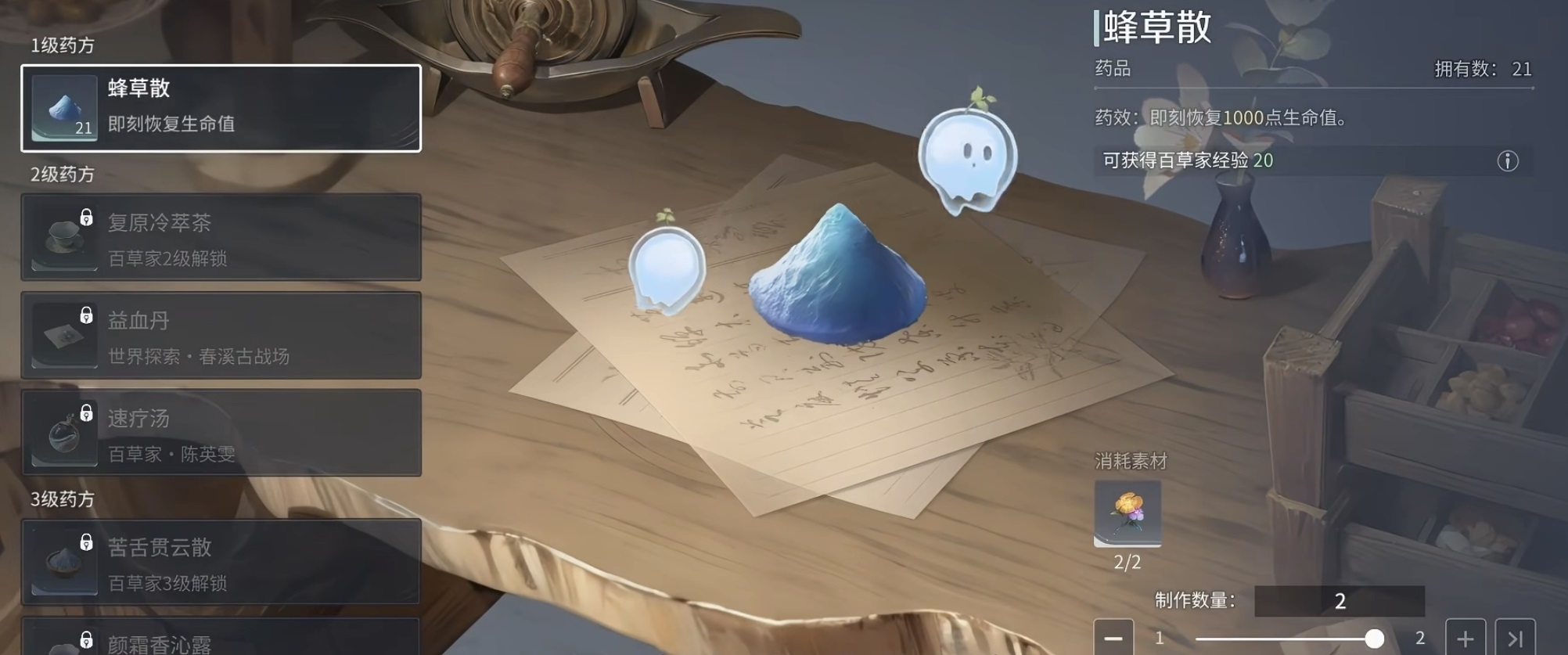 所需药材全部源于大世界自由采集:山坡缓坡、溪流岸边、瀑布落点周边均为高频刷新区域。建议玩家在推进任务途中同步搜寻,实现资源获取效率最大化。配方与药材齐备后,消耗体力即可启动一键批量炼制,成品自动存入背包,战斗中可即时使用。