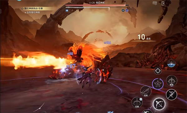 猩红神兽通体燃烧烈焰,战斗分为两大阶段,并在关键血量触发特殊机制,全程需严格分工与躲避技能。