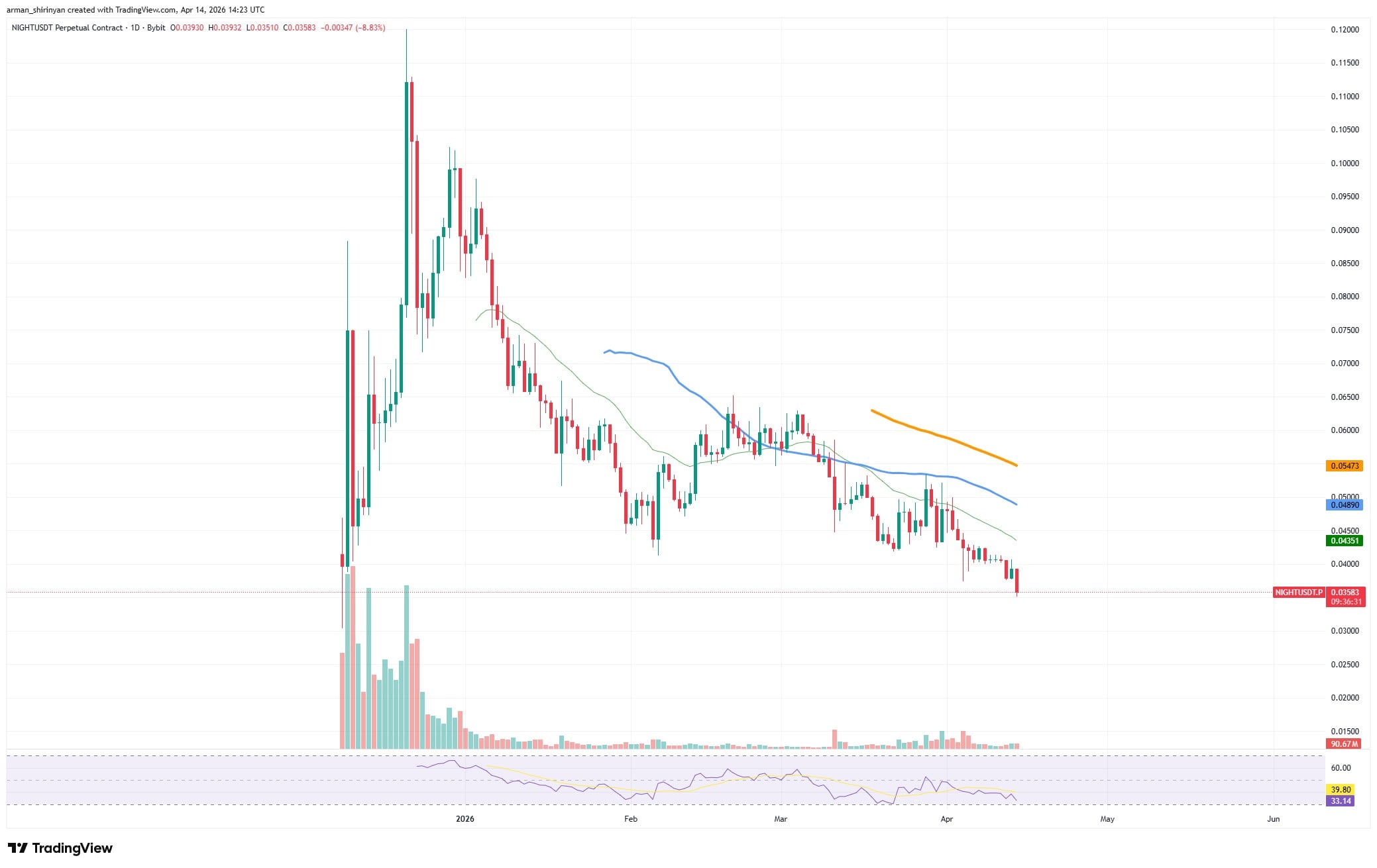 NIGHT现价在0.035至0.036美元区间震荡,持续运行于所有主要移动平均线下方。随着高点下移、低点探底及多次反弹阻力位失败,图表结构呈现明显熊市特征。
