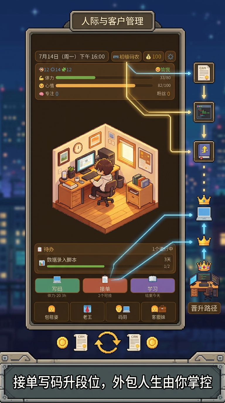 《外包人生》通过高度还原外包从业者的真实成长轨迹,构建出一套兼具策略性与代入感的模拟体系。从狭小出租屋起步,到建立成熟工作室,每一步都需理性判断与长期规划。唯有稳扎稳打、科学进阶,方能在虚拟职场中走出属于自己的逆袭之路。