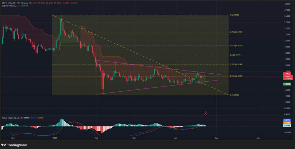 XRP现报1.41美元,虽近期回调但结构显示突破潜力,因整理区间持续收窄。该代币已五周未能突破1.50美元关口,交易者持续关注该阻力位。此外,价格走势呈现对称三角形内缩窄震荡,此类形态通常预示趋势延续。