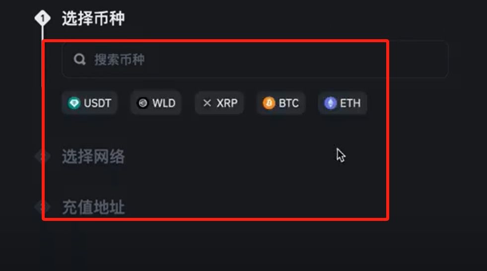 第三步:选择目标币种及对应网络,复制生成的充值地址。